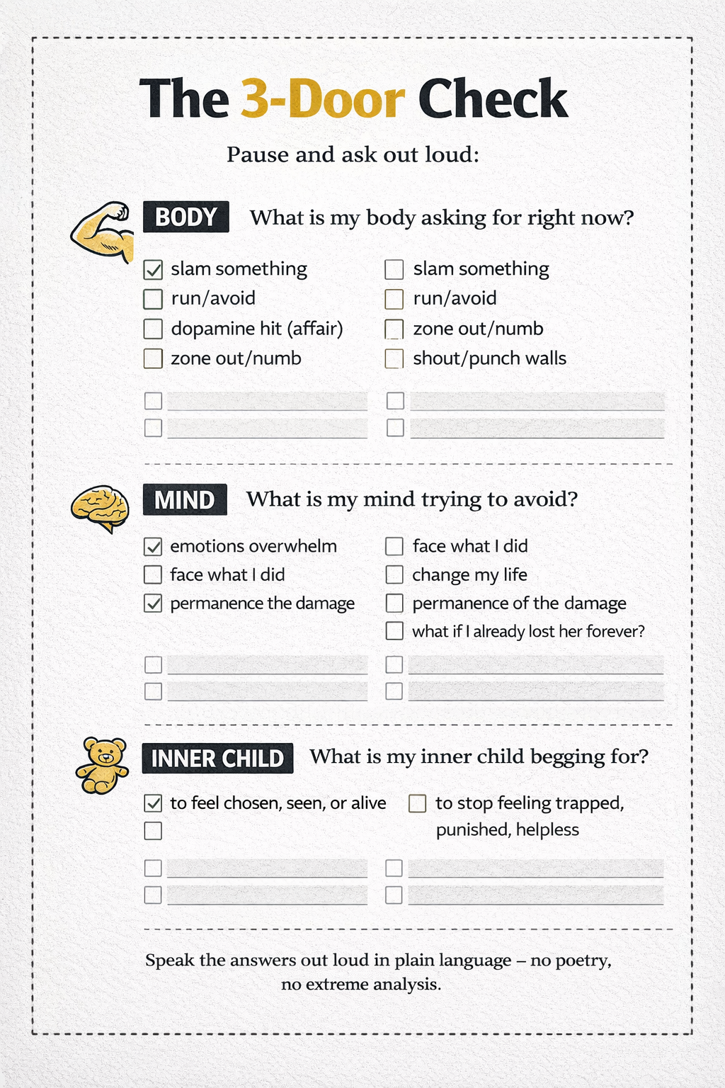 Start with state control (3-Door Check) and meaning-making (what you were trying to feel / stop feeling) so you can build a real prevention plan.