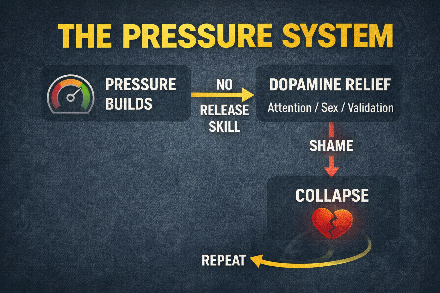 An internal pressure system that never learned how to release, so it leaks into secrecy, validation, impulsive dopamine hits, rage, and numbness… until it leaks into the one thing you swore you’d never do.